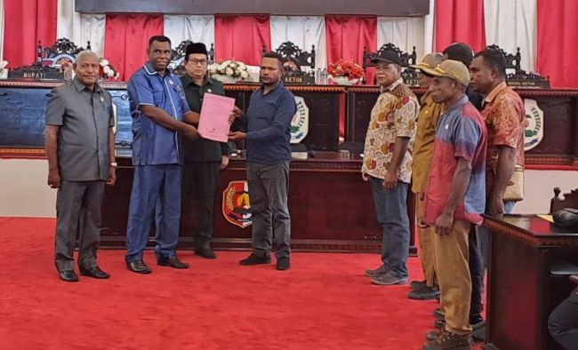 Akhir rapat ditandai dengan penyerahan resmi surat pernyataan sikap masyarakat Teluk Patipi kepada DPRK Fakfak, diterima oleh Ketua Komisi I, Wilson Sony Hegemur.