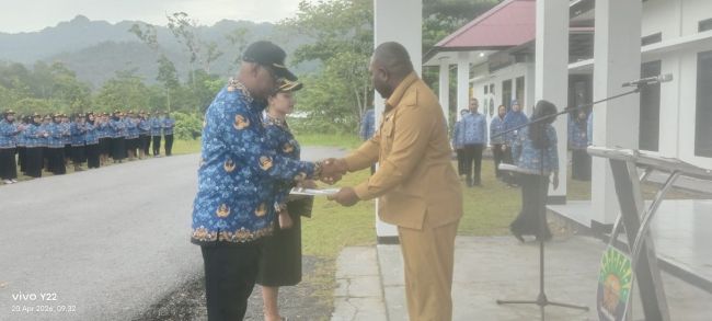 Penyerahan SK berlangsung dalam apel resmi di halaman Kantor Badan Kepegawaian dan Pengembangan Sumber Daya Manusia (BKPSDM) Kabupaten Kaimana, Jalan Lingkar Batu Putih, Kelurahan Kroy, Distrik Kaimana, Senin (20/4/2026).