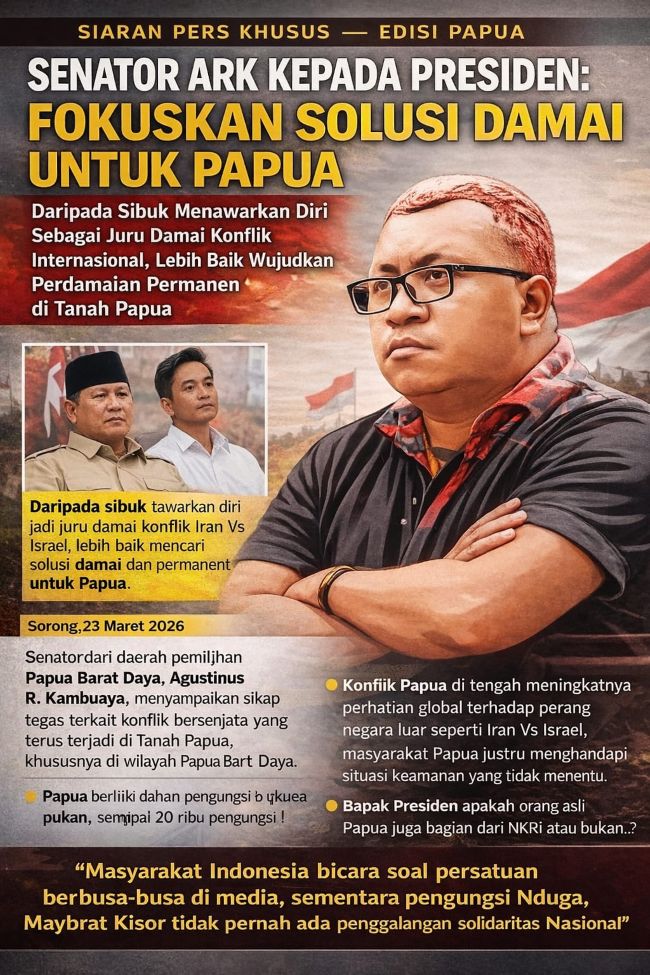 Sorong — Senator Papua Barat Daya, Agustinus R. Kambuaya (ARK), meminta Presiden Prabowo Subianto dan Wakil Presiden Gibran Rakabuming Raka memprioritaskan penyelesaian konflik bersenjata di Tanah Papua.