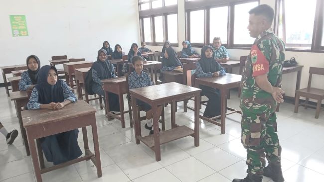 Fakfak – Anggota Babinsa Koramil 1803-01/ kota serda Taher Kutanggas memmberikan pemahaman wawasan kebangsaan kepada siswa siswi SMP Negeri 2 Fakfak, Distrik Fakfak Tengah, Kabupaten Fakfak, Papua Barat, Rabu (03/7/2024).