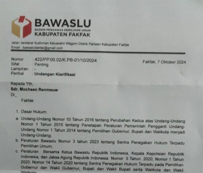 Fakfak – Sekretaris PWI Kabupaten Fakfak, Salmom Teriraun menegaskan, Bawaslu Kabupaten Fakfak tidak mempunyai hak memanggil wartawan untuk mengklarafikasi sebuah pemberitaan.
