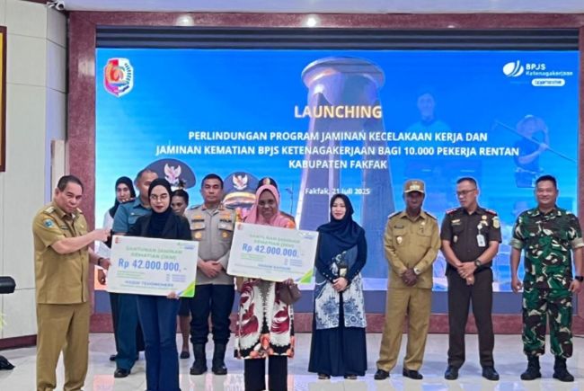FakfakBupati Fakfak, Samaun Dahlan, secara resmi meluncurkan program perlindungan jaminan kecelakaan kerja dan jaminan kematian bagi pekerja rentan di Kabupaten Fakfak, melalui kerja sama dengan BPJS Ketenagakerjaan, di gedung Windert Tuare Fakfak, Senin (21/7/2025).