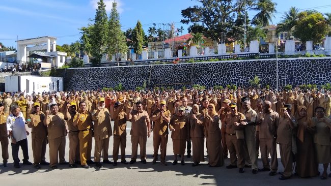 Fakfak – Bupati Fakfak Untung Tamsil dan Wakil Bupati Fakfak Yohana Hindom berpamitan ke para Aparatur Sipil Negara (ASN) yang ada lingkungan Pemerintah Kabupaten (Pemkab) Fakfak dalam apel pagi di halaman Kantor Bupati Fakfak, Senin (23/9/2024).