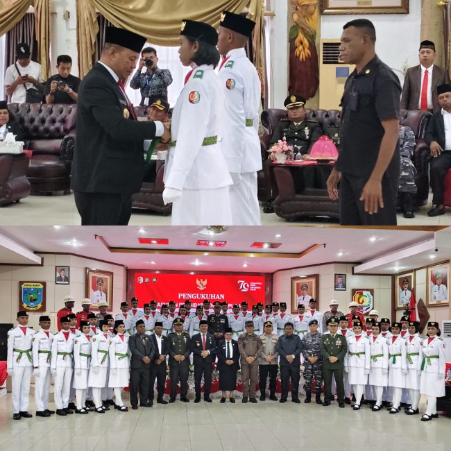 Fakfak – Bupati Fakfak, Untung Tamsil resmi mengukuhkan 80 anggota Pasukan Pengibar Bendera Pusaka (Paskibraka) di gedung Winder Tuare Kabupaten Fakfak, Jumat (16/8/2024) siang.