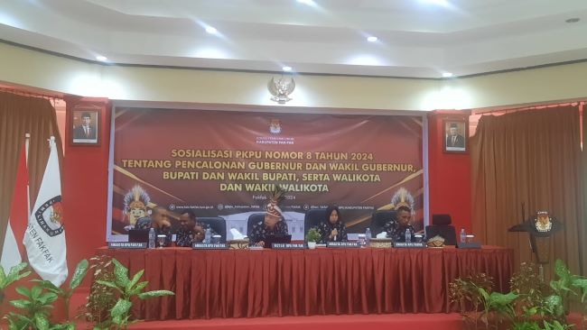 “Pendaftaran pasangan calon 27 – 29 Agustus 2024,” ujar Kordinator Divisi Sosdikli Parmas SDM KPU Kabupaten Fakfak, Nur Hasmiah saat mensosialisasikan Peraturan Komisi Pemilihan Umum (PKPU) Nomor 8 Tahun 2024 tentang Pencalonan Gubernur dan Wakil Gubernur, Bupati dan Wakil Bupati serta Walikota dan Wakil Walikota pada pelaksanaan Pilkada Serentak Tahun 2024, di Ball Room Hotel Grand Papua Fakfak, Selasa (23/7/2024).