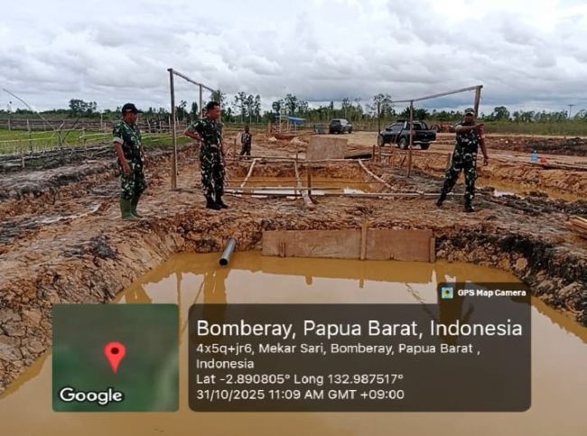 Fakfak – Komandan Kodim (Dandim) 1803/Fakfak, Letkol Inf Wahlin Rahman, S.Pd., meninjau lokasi lahan Kompi Produksi dan lahan Integrated Farming di Kampung Onim Jaya, Distrik Bomberay, Kabupaten Fakfak, Papua Barat, Jumat (31/10/2025).
