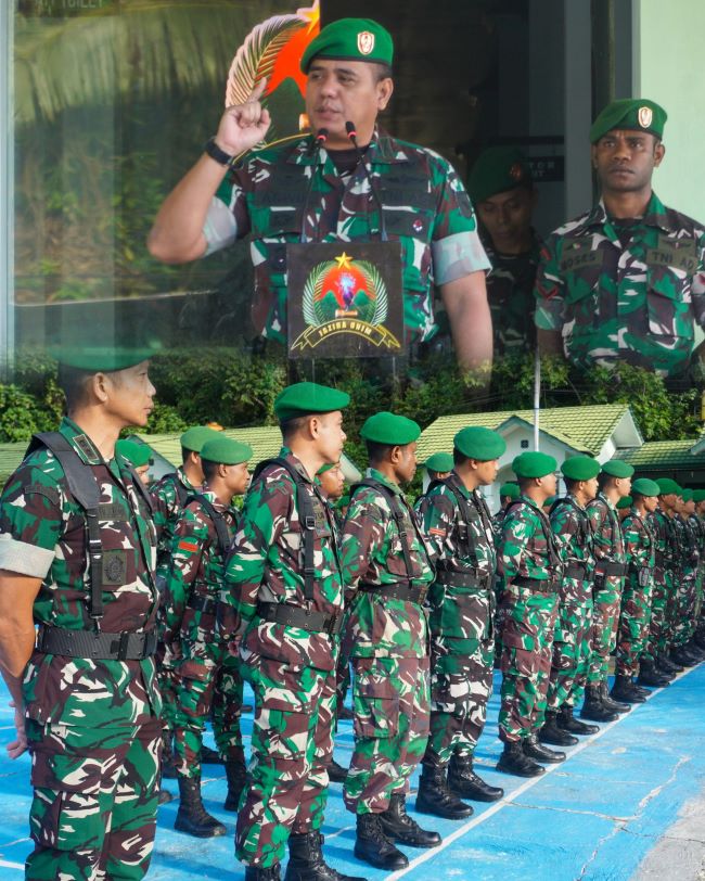 Fakfak – Komandan Korem (Danrem) 182/Jazira Onim, Kolonel Inf Aswin Kartawijaya pimpin Apel Siaga antisipasi Perkembangan Situasi (Bangsit) pada pengambilan sumpah dan janji pelantikan Presiden RI dan Wakil Presiden Republik Indonesia, Minggu 20 Oktober 2024.