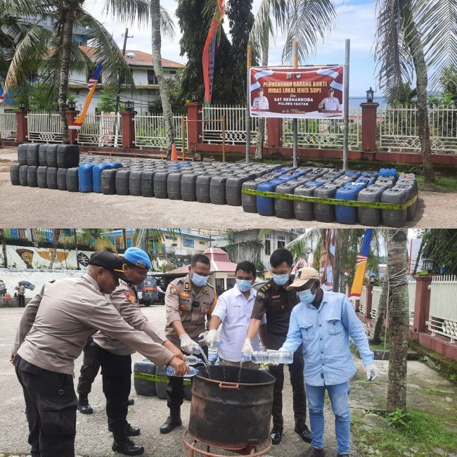 Adapun Barang Bukti yang diamankan, sebut Kapolres, 204 Gen ukuran 30 lter berisikan miras jenis Sopl, satu unit Kapal kayu ukuren kurang lebih 15x 2 meter.