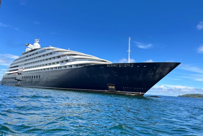 Fakfak – Kapal pesiar mewah MV Scenic Eclipse II berbendera Bahama, yang dinakhodai oleh Capt. Sakkariassen Torry, berlabuh di Pelabuhan Kokas, Kabupaten Fakfak, Papua Barat, pada Senin (6/10/2025).