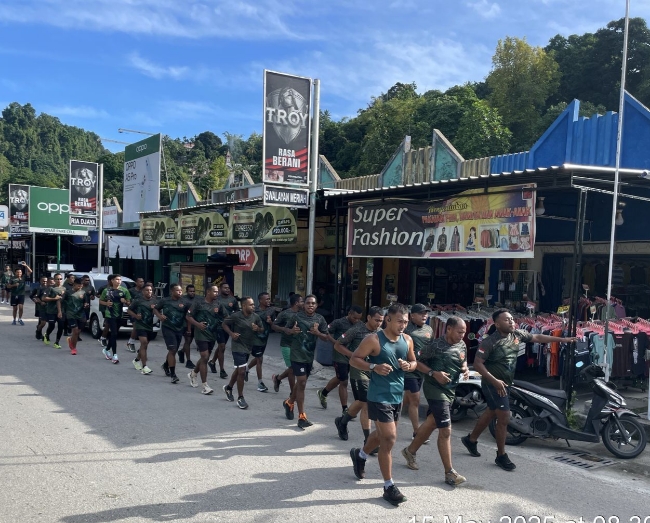 Fakfak – Prajurit Kodim 1803/Fakfak di bawah pimpinan Komandan Kodim (Dandim) 1803/Fakfak Letkol Inf Lukman Permana, S.E, melaksanakan kegiatan pembinaan fisik Lari Aerobik Guna meningkatkan ketahanan fisik prajurit Kodim 1803/Fakfak, Kabupaten Fakfak, Provinsi Papua Barat, Kamis (15/05/2025).