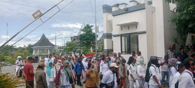 Setibanya di depan Kantor Bupati, para peserta aksi menunggu beberapa saat sebelum belasan perwakilan diizinkan masuk untuk melakukan audiensi dengan pemerintah daerah.