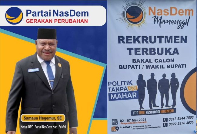 Fakfak – Partai NasDem memanggil kader partai dan toko masyarakat untuk mendaftarkan diri sebagai Bakal Calon (Bacalon) Bupati dan Wakil Bupati Fakfak dimulai 2 sampai 7 Mei 2024.