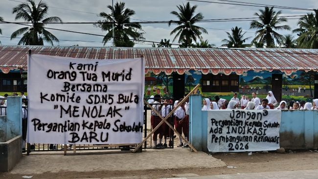 Bula – Sejumlah orang tua murid SD Negeri 5 Bula, Desa Sesar, Kecamatan Bula, Kabupaten Seram Bagian Timur (SBT), memprotes pergantian kepala sekolah dengan memalang pagar sekolah pada Selasa (28/10/2025) pagi.