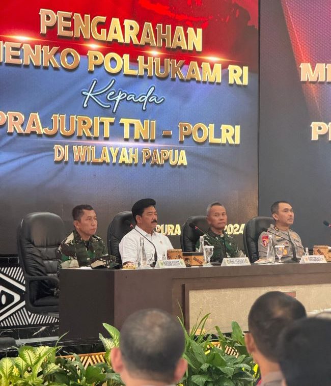 Manokwari – Pangdam XVIII/Kasuari, Mayjen TNI Haryanto, S.I.P., M.Tr.(Han)., menghadiri pengarahan yang diberikan oleh Menteri Koordinator Bidang Politik, Hukum, dan Keamanan (Menko Polhukam) Marsekal TNI (Purn.) Hadi Tjahjanto kepada prajurit TNI dan Polri di wilayah Papua, Jayapura, pada Kamis (30/5/2024). Pengarahan ini bertujuan untuk memperkuat koordinasi dan sinergi antar aparat keamanan dalam menjaga stabilitas dan keamanan di wilayah Papua menjelang pesta demokrasi Pilkada serentak.
