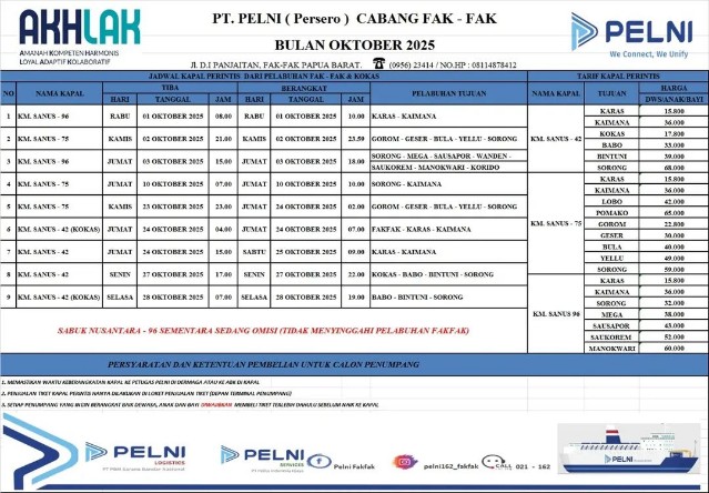 Fakfak — PT Pelayaran Nasional Indonesia (Persero) atau PELNI Cabang Fakfak merilis jadwal pelayaran kapal perintis dari Pelabuhan Fakfak dan Kokas untuk bulan Oktober 2025.