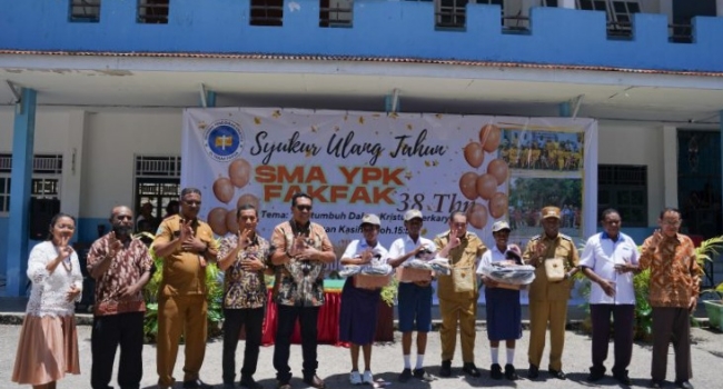 Bupati Fakfak, Samaun Dahlan dan Wakil Bupati Donatus Nimbitkendik foto bersamaSuasana penuh sukacita terlihat saat para siswa menerima bantuan tersebut, yang kemudian dilanjutkan dengan pemotongan kue ulang tahun dan sesi foto bersama sebagai penutup perayaan HUT ke-38 SMK YPK Fakfak.