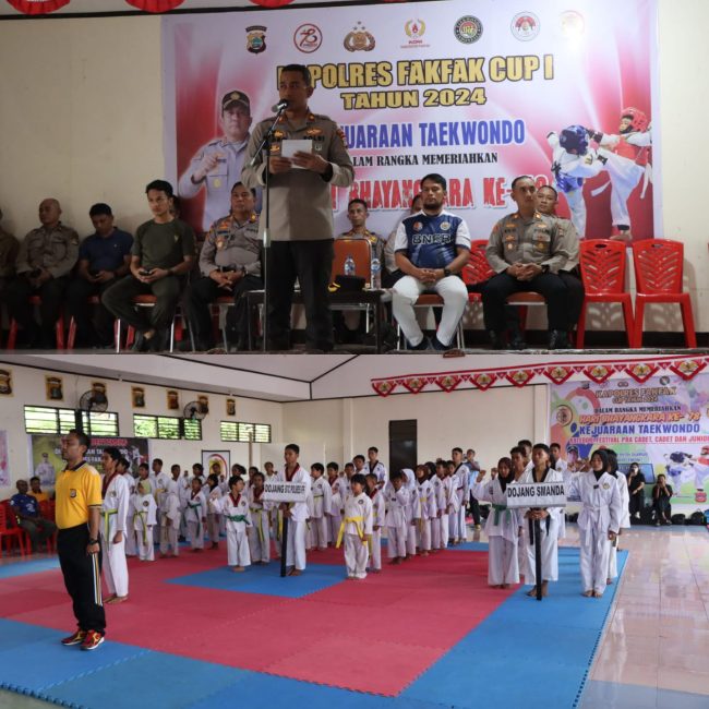 Fakfak – Pertandingan Taekwondo Kapolres Fakfak Cup I Tahun 2024 secara resmi dibuka oleh Waka Polres Fakfak Kompol Indro Riskiadi, S.I.K di Aula Anton Sudjarwo Polres Fakfak, Jumat (28/6/2024)