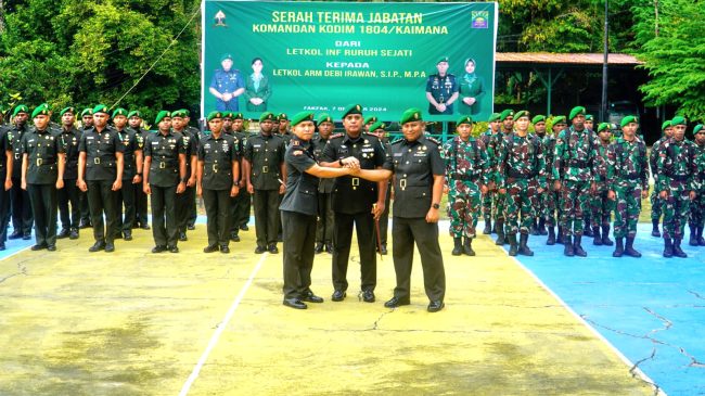 Fakfak – Komandan Korem 182/JO, Kolonel Inf Aswin Kartawijaya memimpin serah terima jabatan Komandan Kodim 1804/Kaimana dari pejabat lama Letkol Inf Ruruh Sejati kepada Letkol Arm Debi Irawan, S.I.P.,M.P.A dan tradisi satuan di Lapangan Makorem 182/Jazira Onim, Senin, (7/10/2024).