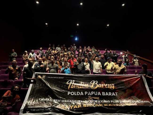 Manokwari – Kepolisian Daerah (Polda) Papua Barat menggelar kegiatan nonton bersama film Sayap Sayap Patah 2 bersama sejumlah organisasi masyarakat (ormas), Kamis (15/5/2025) di Bioskop XXI Manokwari. Kegiatan dimulai pukul 16.00 WIT dan diikuti sekitar 180 peserta.