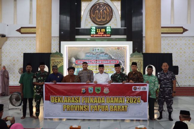 Guna menciptakan suasana aman damai menjelang Pilkada ini Kepolisian Negara Daerah Papua Barat melalui Resor Fakfak menggelar Tabligh Akbar dan Deklarasi Pilkada Damai 2024 di Masjid Agung Baitul Makmur, Jalan Samratulangi, Kelurahan Wagom, Distrik Pariwari Fakfak, Kabupaten Fakfak, Minggu, (4/8/2024) pukul 10.00 WIT,