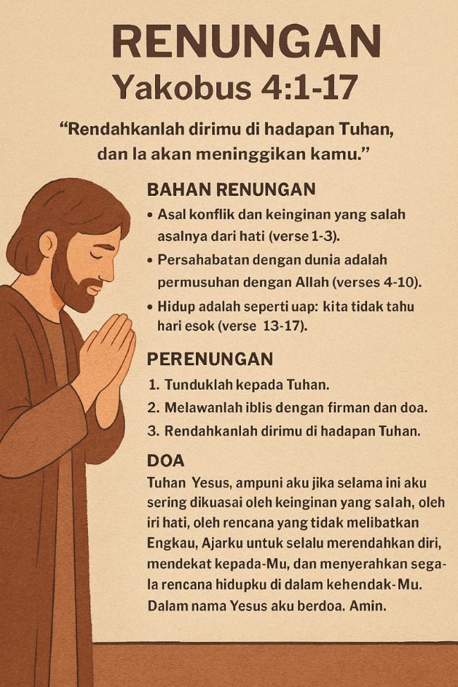 Tuhan Yesus, ampuni aku jika selama ini aku sering dikuasai oleh keinginan yang salah, oleh iri hati, oleh rencana yang tidak melibatkan Engkau. Ajarku untuk selalu merendahkan diri, mendekat kepada-Mu, dan menyerahkan segala rencana hidupku di dalam kehendak-Mu. Sebab hidupku adalah milik-Mu, dan aku mau berjalan seturut firman-Mu. Dalam nama Yesus aku berdoa. Amin.