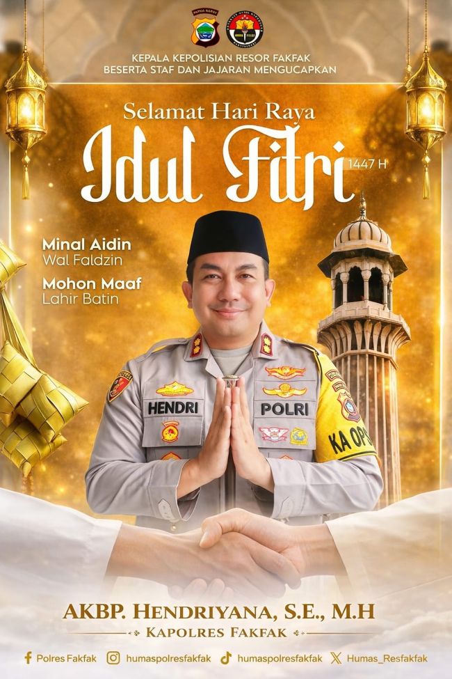 “Atas nama pribadi dan keluarga besar Polres Fakfak, kami mengucapkan Selamat Hari Raya Idul Fitri 1447 Hijriah, mohon maaf lahir dan batin. Semoga perayaan ini membawa kedamaian dan keselamatan bagi kita semua,” kata Hendriyana. (rls/pr)
