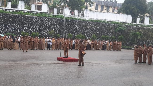 Bagaimana ASN yang ikut apel tidak bertahan, Bupati Untung Tamsil melepas topi dari kepalanya dan ikut menikmati turunnya hujan sembari memberikan arahan.