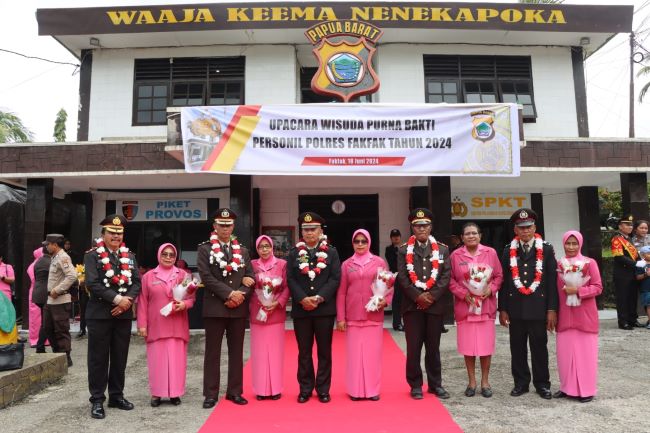 Fakfak – Kepolisian Resor Fakfak, Polda Papua Barat mengadakan Upacara Wisuda Purnabakti Personel Polres Fakfak Tahun 2024 yang berlangsung di halaman apel Mapolres, Senin (18/6/2024).